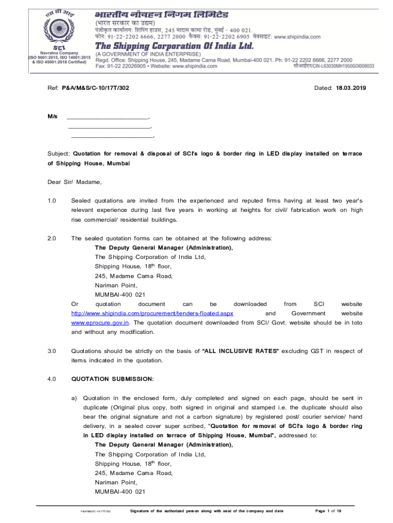 Ref: P&A/M&S/C10/17T/302M/stated: 18.03.2019___, ___, ___, Subject: Quotation for removal & disposal of Sci logo & border ring in LED display installed on terrace of Shipping House, Mumbai Dear Sir/