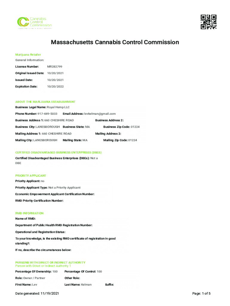 Get the free Royal Hemp LLCMR282799 - Cannabis Control Commission
