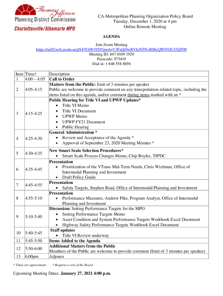 Metropolitan Planning Organization Policy Board Tuesday, December 1, 2020, at 4 pm Online Remote Meeting AGENDA Join Zoom Meeting https://us02web.zoom.us/j/84701091920?pwdV3FxQi9wRVIzNTNvR08yQWl5OU53QT09