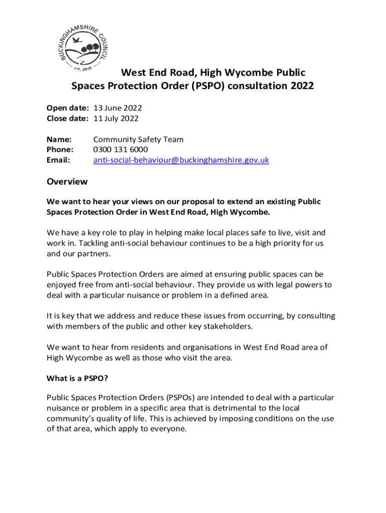 West End Road, High Wycombe Public Spaces Protection Order (PSP) consultation 2022 Open date: 13 June 2022 Close date: 11 July 2022 Name: Phone: Email:Community Safety Team 0300 131 6000 antisocialbehaviour@buckinghamshire.gov.ukOverview