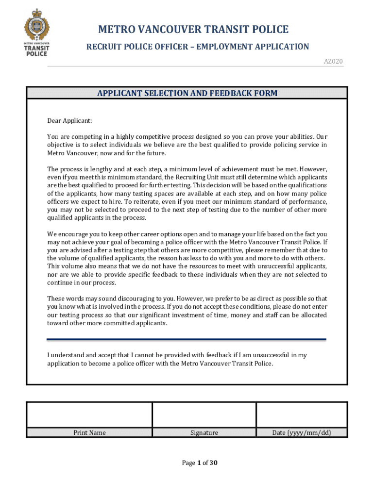 METRO VANCOUVER TRANSIT POLICE RECRUIT POLICE OFFICER EMPLOYMENT APPLICATION AZ020APPLICANT SELECTION AND FEEDBACK FORM Dear Applicant: You are competing in a highly competitive process designed,