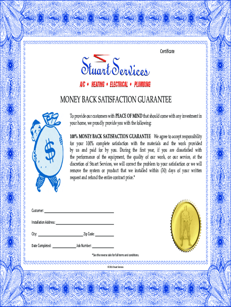 Certificate 000110000MONEY BACK SATISFACTION GUARANTEE To provide our customers with PEACE OF MIND that should come with any investment in your home, we proudly provide you with the following: 100%