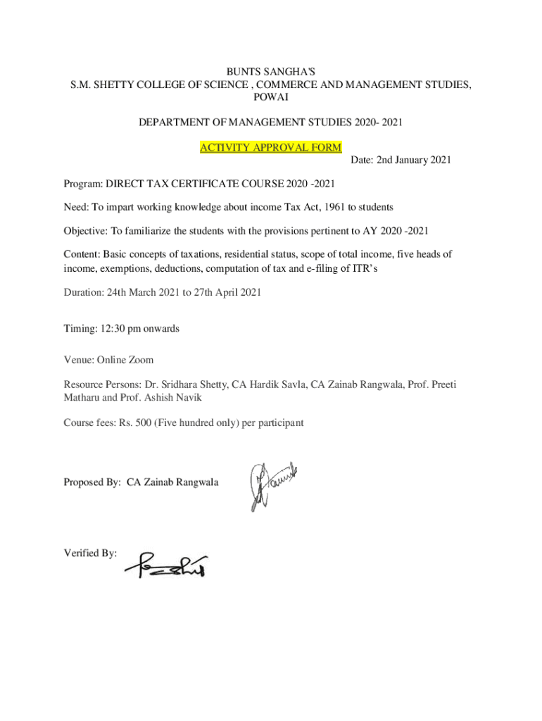 BUNTS SAN GHA\'S S.M. SHETTY COLLEGE OF SCIENCE, COMMERCE AND MANAGEMENT STUDIES, POW AI DEPARTMENT OF MANAGEMENT STUDIES 2020 2021 ACTIVITY APPROVAL FORM Date: 2nd January 2021 Program: DIRECT TAX