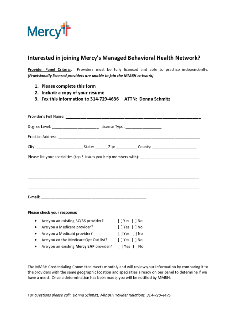 Interested in joining Mercy's Managed Behavioral Health Network? Provider Panel Criteria: Providers must be fully licensed and able to practice independently. (Provisionally licensed providers are