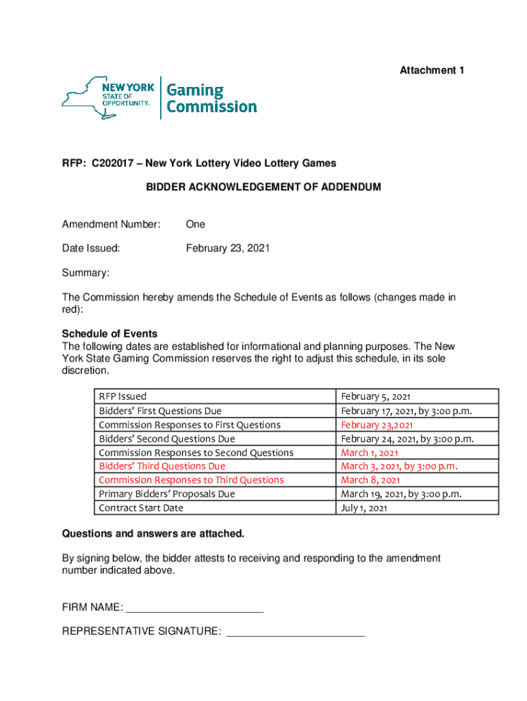 Attachment 1RFP: C202017 New York Lottery Video Lottery Games BIDDER ACKNOWLEDGEMENT OF ADDENDUMAmendment Number:Operate Issued:February 23, 2021Summary: The Commission hereby amends the Schedule