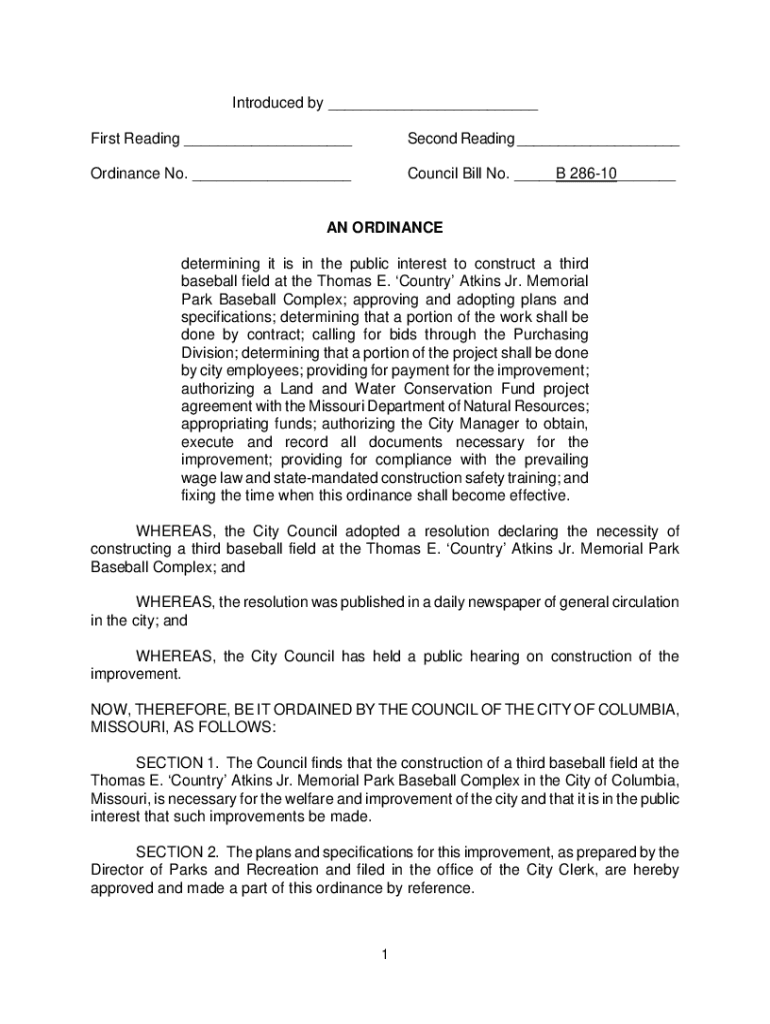 Introduced by ___ First Reading ___Second Reading ___Ordinance No. ___Council Bill No. ___B 28610___AN ORDINANCE determining it is in the public interest to construct a third baseball field at the