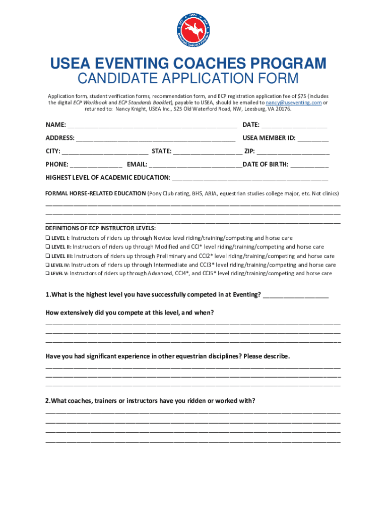 USED EVENTING COACHES PROGRAM CANDIDATE APPLICATION FORM, student verification forms, recommendation form, and ECP registration application fee of $75 (includes the digital ECP Workbook and ECP Standards