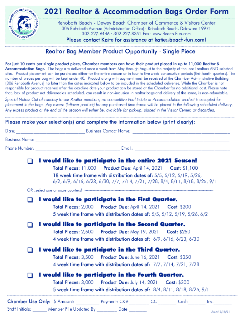2021 Realtor & Accommodation Bags Order Form Robot Beach Dewey Beach Chamber of Commerce & Visitors Center 306 Robot Avenue (Administration Office) Robot Beach, Delaware 19971 3022276446 3022278351