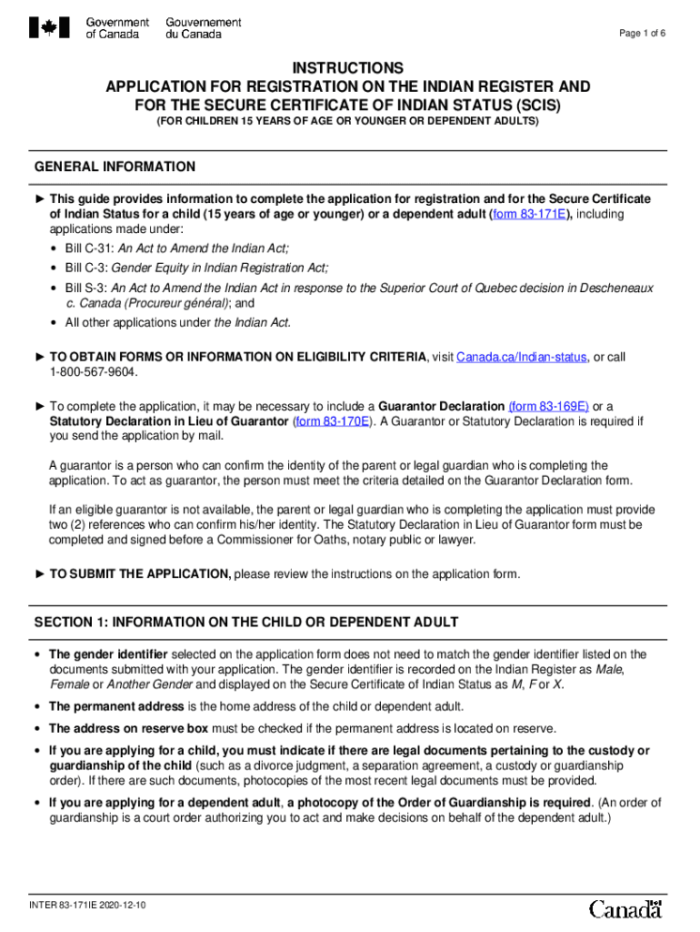 Page 1 of 6INSTRUCTIONS APPLICATION FOR REGISTRATION ON THE INDIAN REGISTER AND FOR THE SECURE CERTIFICATE OF INDIAN STATUS (SCSI) (FOR CHILDREN 15 YEARS OF AGE OR YOUNGER OR DEPENDENT ADULTS)GENERAL