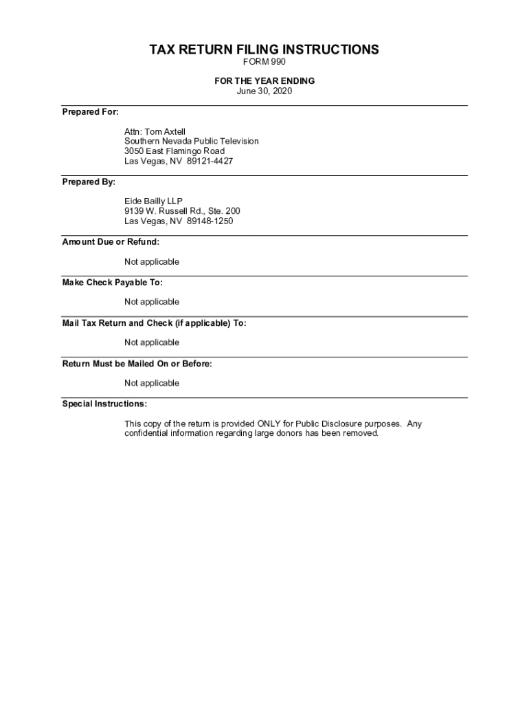 TAX RETURN FILING INSTRUCTIONS FORM 990FOR THE YEAR ENDING June 30, 2020, Prepared For: Attn: Tom Ax tell Southern Nevada Public Television 3050 East Flamingo Road Las Vegas, NV 891214427 Prepared