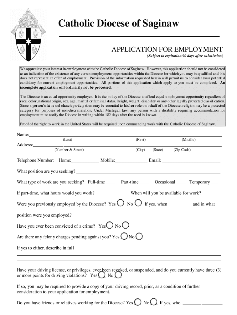 Catholic Diocese of Saginaw ___ APPLICATION FOR EMPLOYMENT (Subject to expiration 90 days after submission) We appreciate your interest in employment with the Catholic Diocese of Saginaw. However,