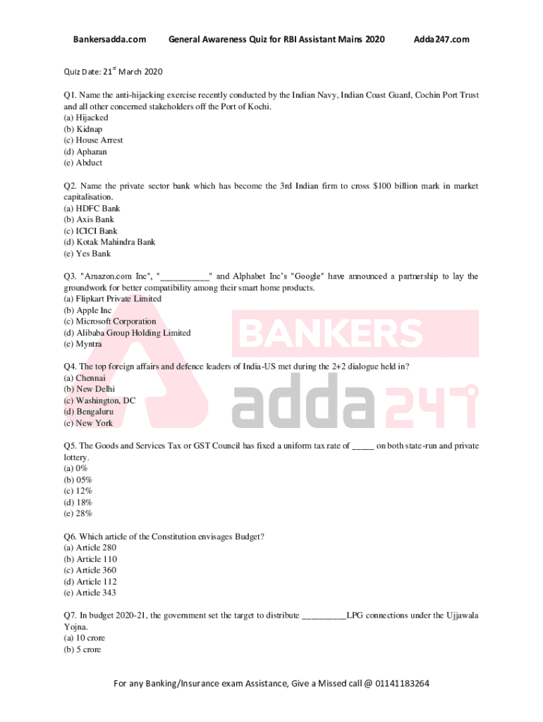 Bankersadda.general Awareness Quiz for RBI Assistant Mains 2020Adda247.comstQuiz Date: 21 March 2020