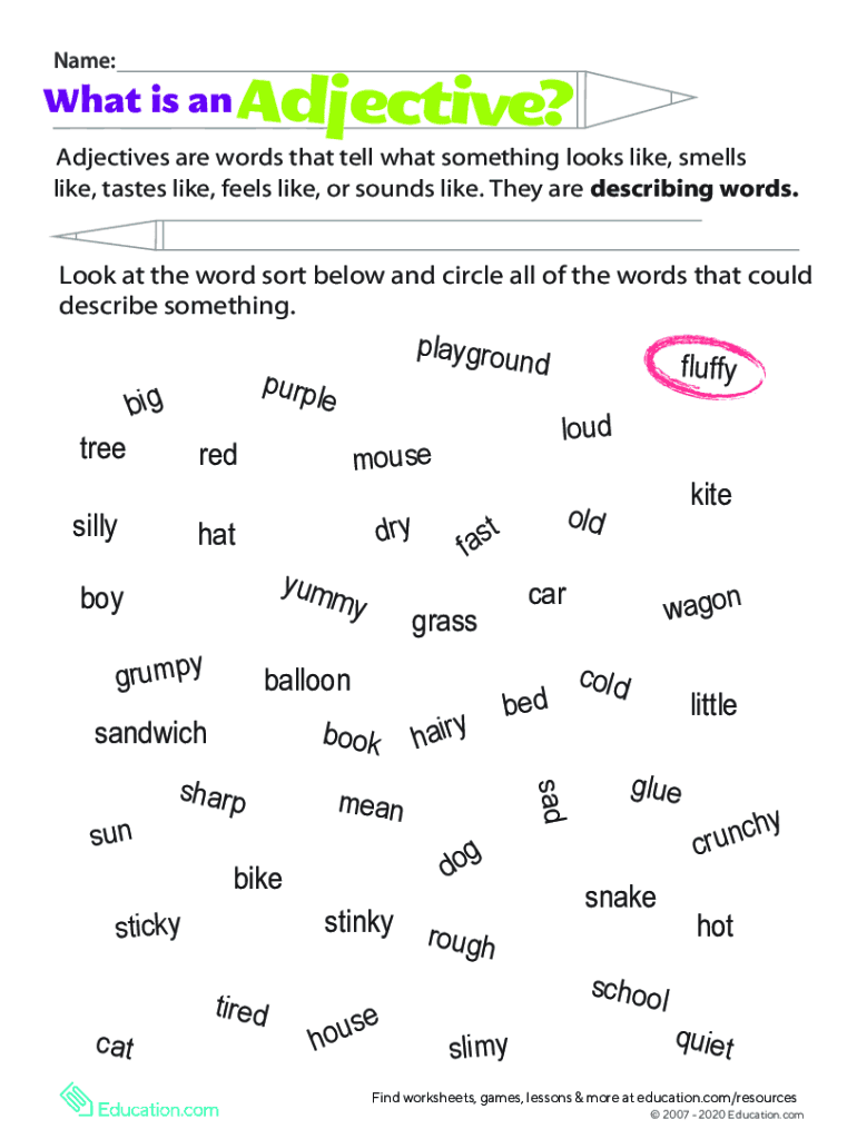 like, tastes like, feels like, or sounds like. They are describing words. Look at the word sort below and circle