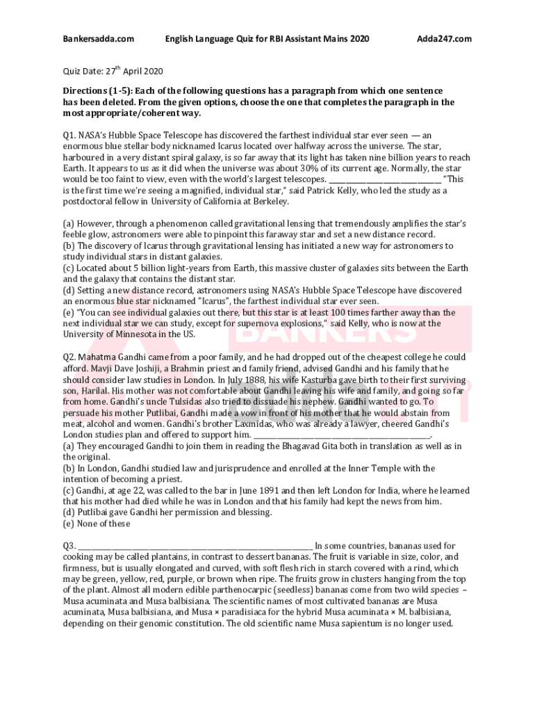 Bankersadda.com English Language Quiz for RBI Assistant Mains 2020Adda247.comic Date: 27th April 2020 Directions (15): Each of the following questions has a paragraph from which one sentence has been