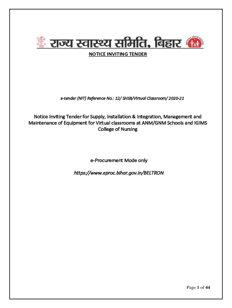 NOTICE INVITING TENDERetender (NIT) Reference No.: 12/ SSB/Virtual Classroom/ 202021Notice Inviting Tender for Supply, Installation & Integration, Management and Maintenance of Equipment for Virtual