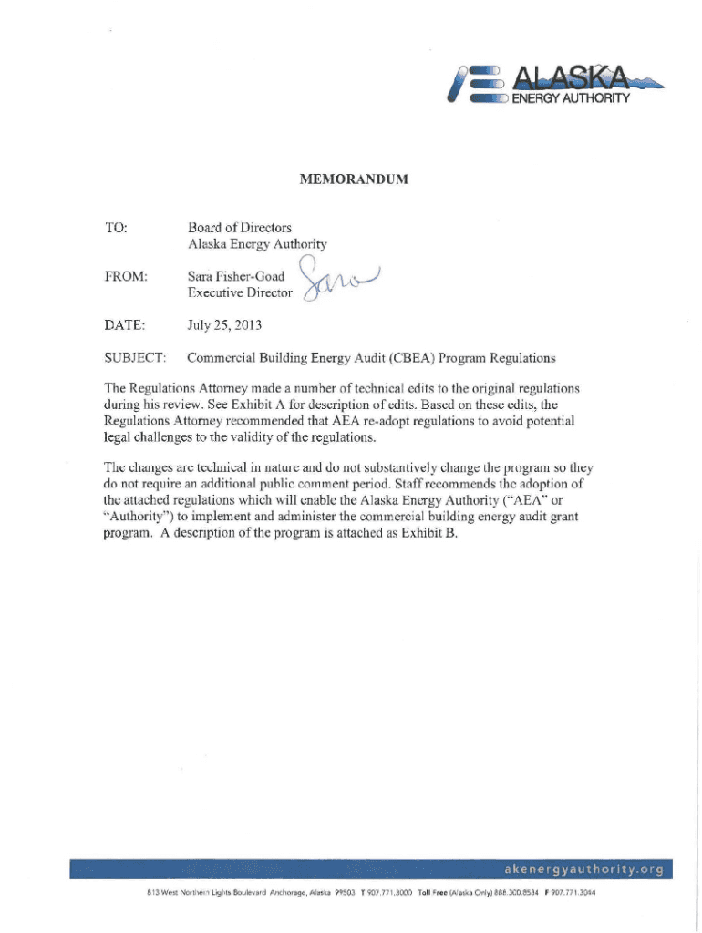 MEMORANDUM TO:Board directors Alaska Energy AuthorityFROM:Sara Fisherman Executive Directorate:July 25,2013SUBJECT:Commercial Building Energy Audit (CBA) Program Regulations(J /\'Lathe Regulations