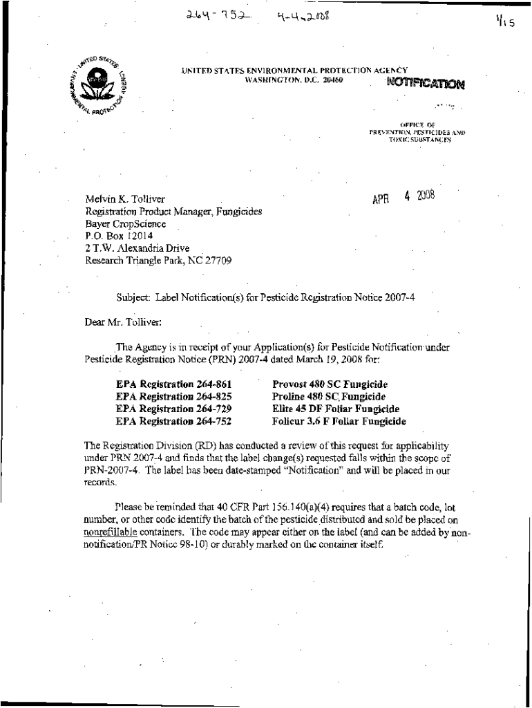 UNITED STATES ENVIRONMENTAL PROTECTION AGENCY WASHINGTON, D.C. 20460NOl1F1CA1\'OFFICE OF PREVENTION. PESTICIDES AND TOXIC SUBSTANCES Melvin K. Oliver Registration Product Manager, Fungicides Bayer