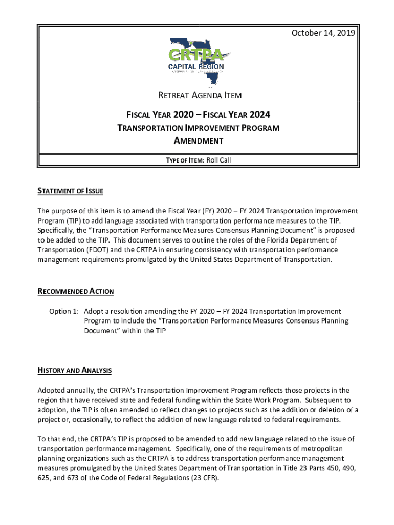 October 14, 2019RETREAT AGENDA ITEM FISCAL YEAR 2020 FISCAL YEAR 2024 TRANSPORTATION IMPROVEMENT PROGRAM AMENDMENT TYPE OF ITEM: Roll Reinstatement OF ISSUE The purpose of this item is to amend the