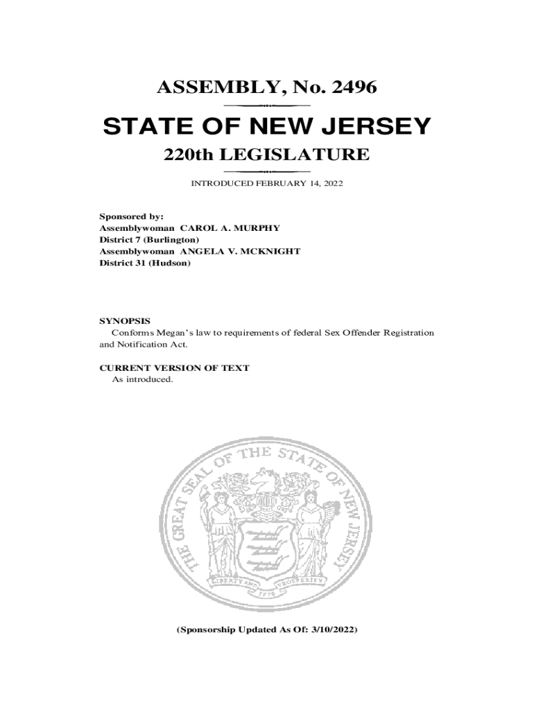ASSEMBLY, No. 2496STATE OF NEW JERSEY 220th LEGISLATURE INTRODUCED FEBRUARY 14, 2022Sponsored by: Assemblywoman CAROL A. MURPHY District 7 (Burlington) Assemblywoman ANGELA V. McKnight District 31
