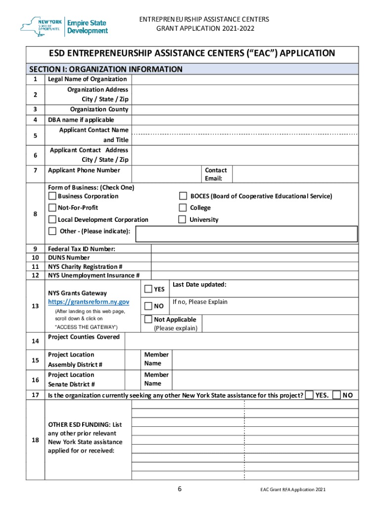 New York StatesREQUEST FOR APPLICATION Entrepreneurship Assistance Centers ISSUED: October 1, 2021, Designated Contacts for this Request for Applications: Primary Contact: John Discolor, Director