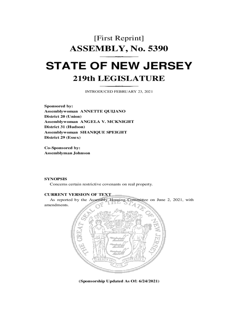 [First Reprint]ASSEMBLY, No. 5390STATE OF NEW JERSEY 219th LEGISLATURE INTRODUCED FEBRUARY 23, 2021Sponsored by: Assemblywoman ANNETTE EQUIANO District 20 (Union) Assemblywoman ANGELA V. McKnight