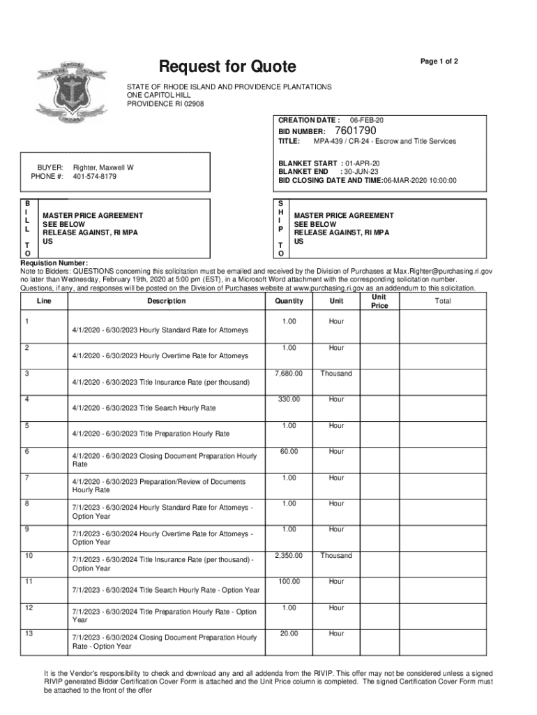Page 1 of 2Request for Quote STATE OF RHODE ISLAND AND PROVIDENCE PLANTATIONS ONE CAPITOL HILL PROVIDENCE RI 02908 CREATION DATE :06FEB20BID NUMBER: 7601790 TITLE: MPA439 / CR24 Escrow and Title ServicesBUYER: