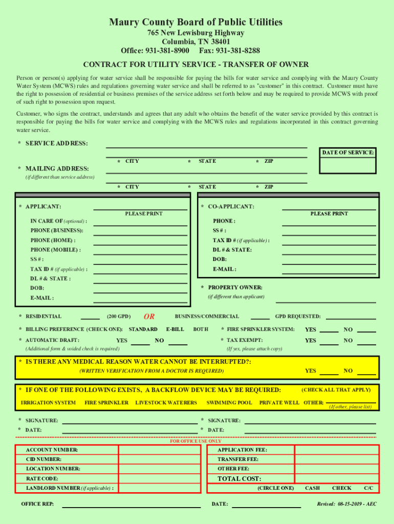 Mary County Board of Public Utilities 765 New Lewis burg Highway Columbia, TN 38401 Office: 9313818900 Fax: 9313818288CONTRACT FOR UTILITY SERVICE TRANSFER OF OWNER Person or person(s) applying for