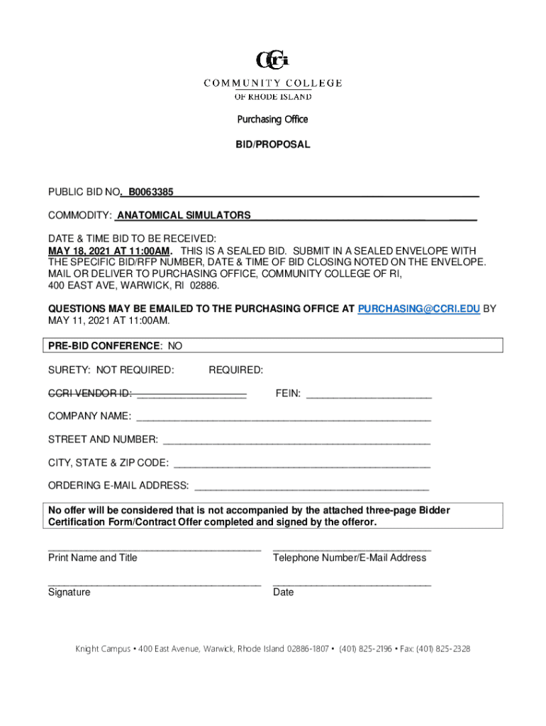 Purchasing Office BID/PROPOSALPUBLIC BID NO. B0063385___COMMODITY: ANATOMICAL SIMULATORS______ ___DATE & TIME BID TO BE RECEIVED: MAY 18, 2021, AT 11:00AM. THIS IS A SEALED BID. SUBMIT IN A SEALED