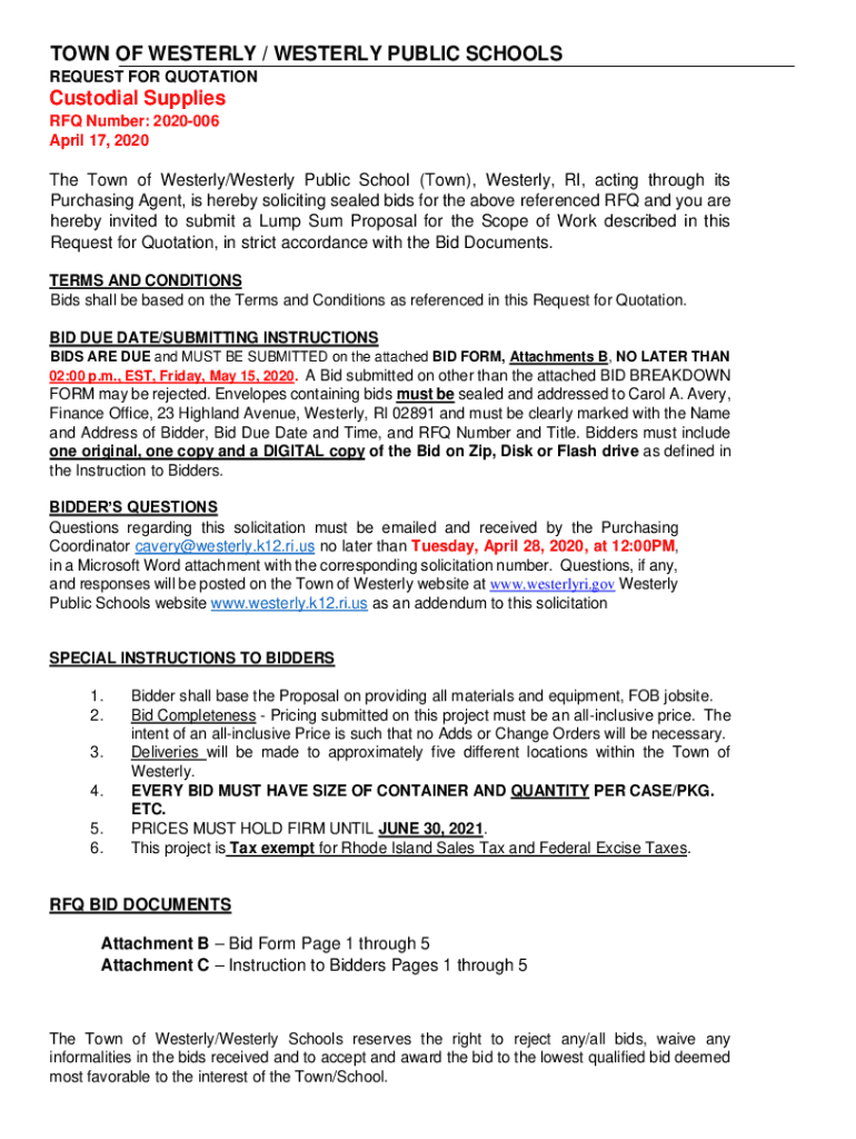TOWN OF WESTERLY / WESTERLY PUBLIC SCHOOLS REQUEST FOR QUOTATIONCustodial Supplies RFQ Number: 2020006 April 17, 2020The Town of Westerly/Westerly Public School (Town), Westerly, RI, acting through