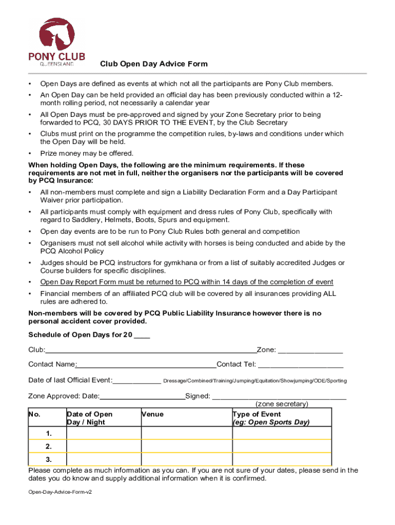 Club Open Day Advice Form Open Days are defined as events at which not all the participants are Pony Club members. An Open Day can be held provided an official day has been previously conducted within