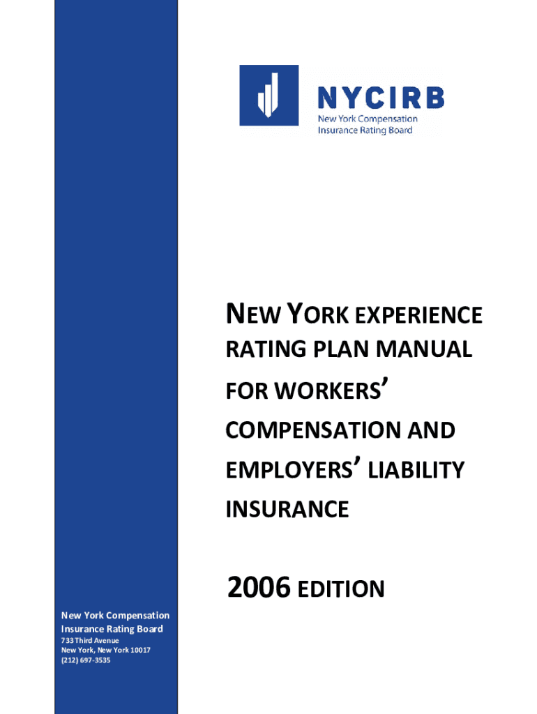 NEWYORKEXPERIENCE RATINGPLANMANUAL COWORKERS COMPENSATION AND EMPLOYERSLIABILITY INSURANCE2006EDITION NewYorkCompensation InsuranceRatingBoard 733ThirdAvenue New York,NewYork10017 (212) 69735352006