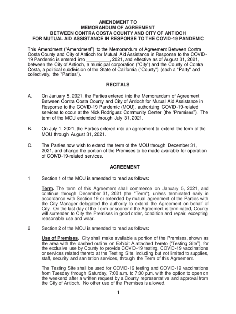 AMENDMENT TO MEMORANDUM OF AGREEMENT BETWEEN CONTRA COSTA COUNTY AND CITY OF ANTIOCH FOR MUTUAL AID ASSISTANCE IN RESPONSE TO THE COVID-19 PANDEMIC This Amendment (Amendment) to the Memorandum of