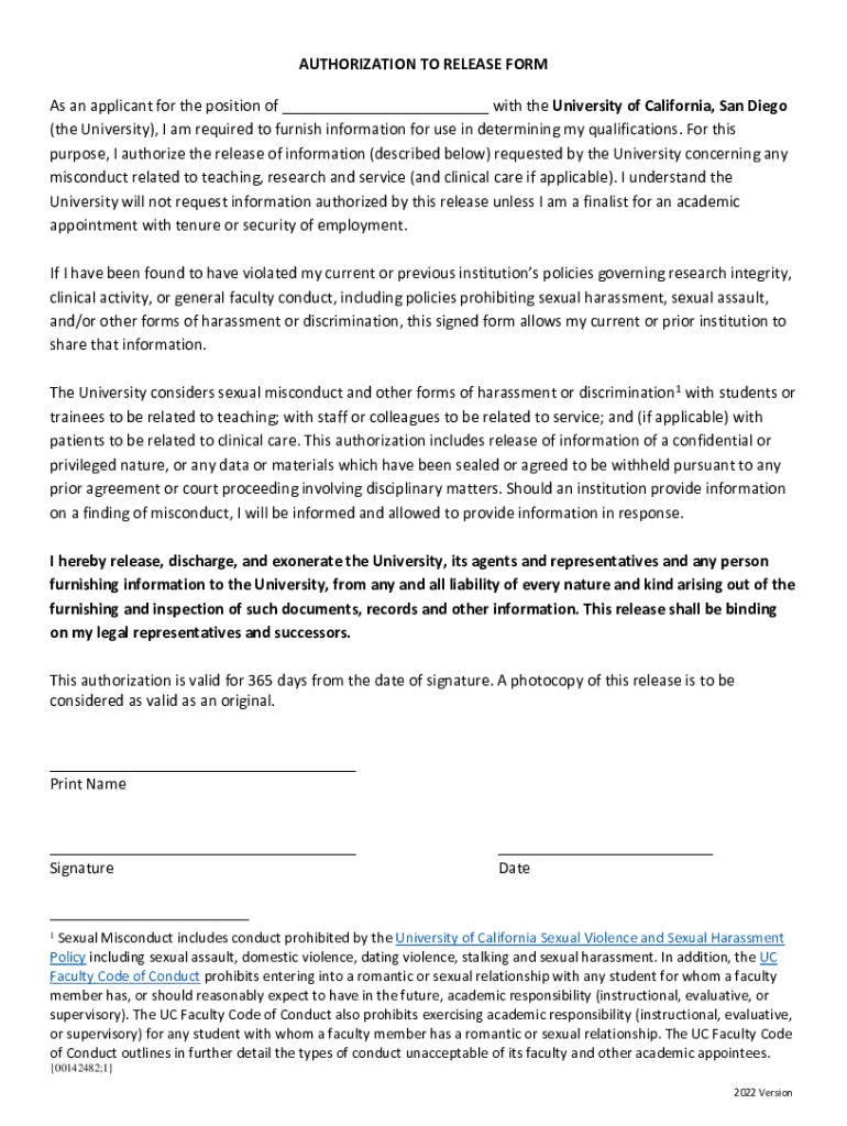 AUTHORIZATION TO RELEASE FORM As an applicant for the position of ___ with the University of California, San Diego (the University), I am required to furnish information for use in determining my
