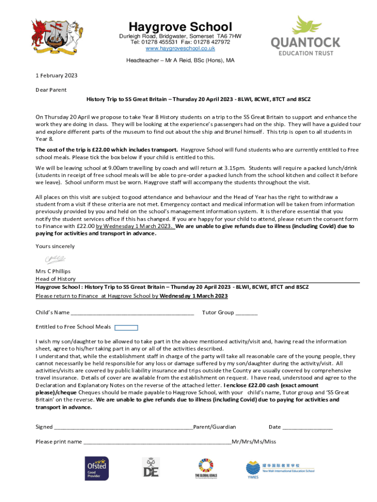 Hay grove School Burleigh Road, Bridgewater, Somerset TA6 7HW Tel: 01278 455531 Fax: 01278 427972 www.haygroveschool.co.uk Headteacher Mr A Reid, B.Sc. (Hons), MA1 February 2023 Dear Parent History
