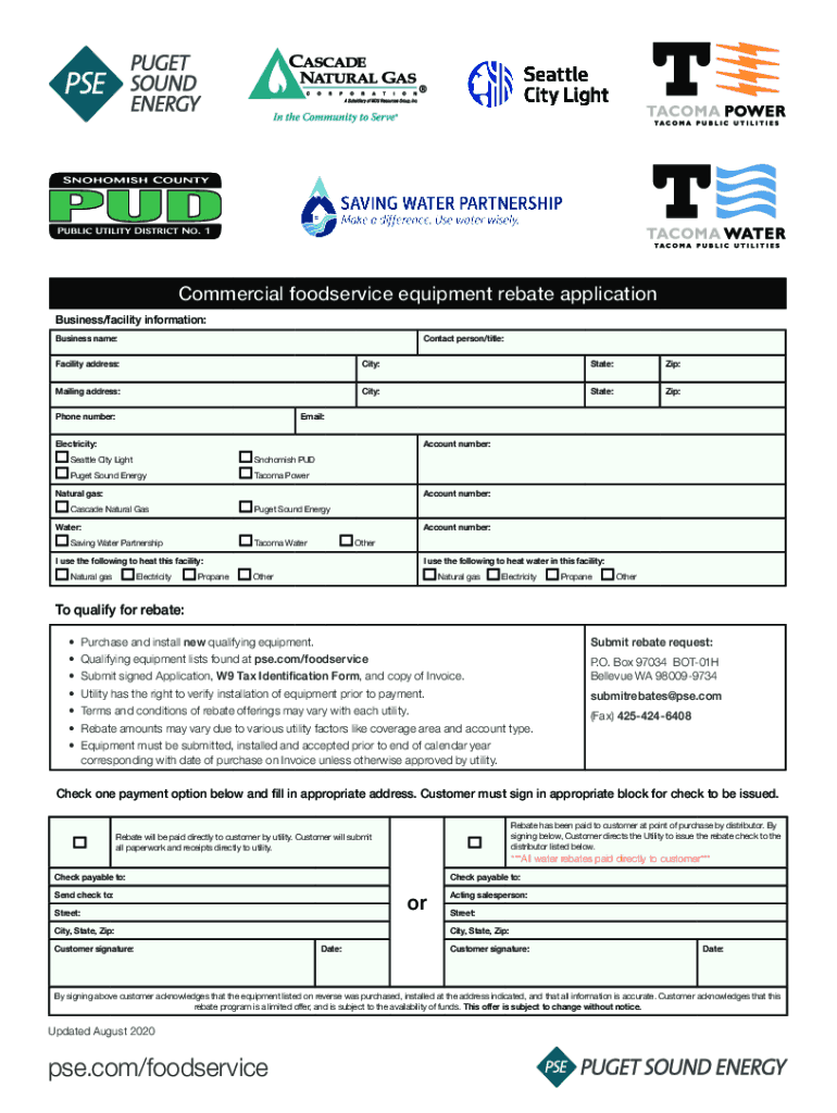 Commercial food service equipment rebate application Business/facility information: Business name:Contact person/title:Facility address:City:State:Zip:Mailing address:City:State:Zip:Phone number:Email:Electricity:Account