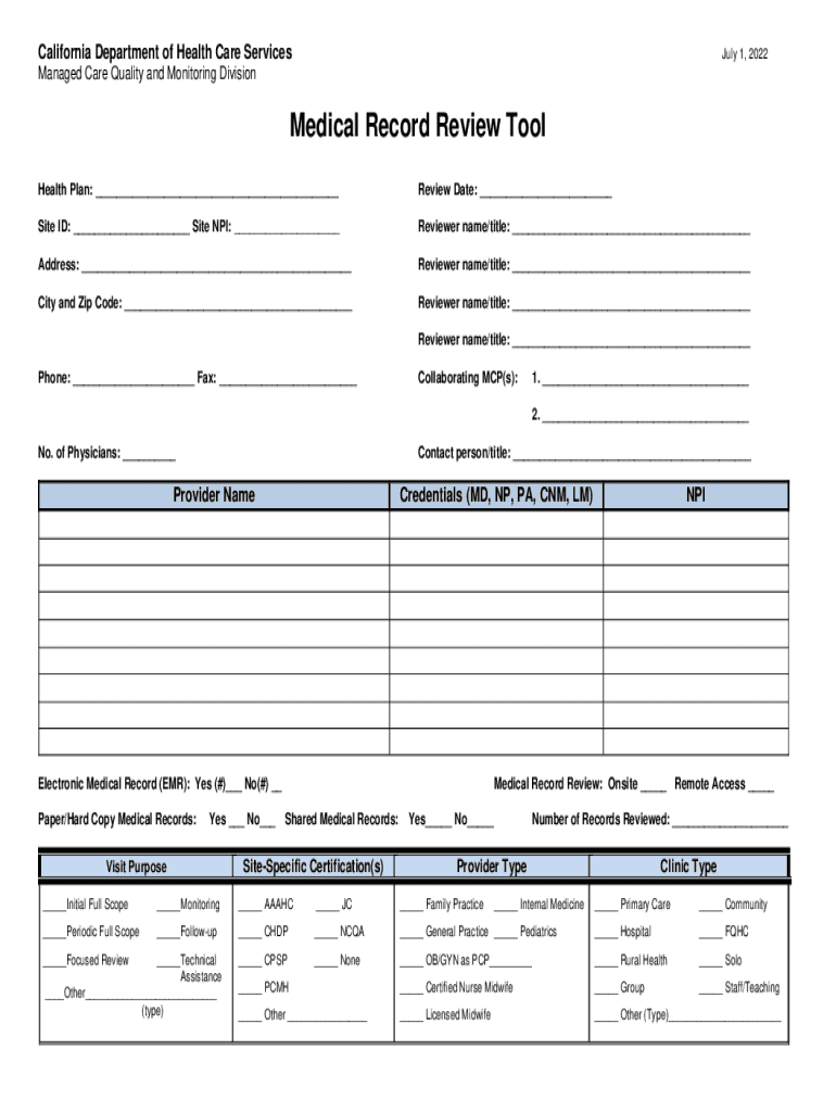 California Department of Health Care Services July 1, 2022Managed Care Quality and Monitoring DivisionMedical Record Review Tool