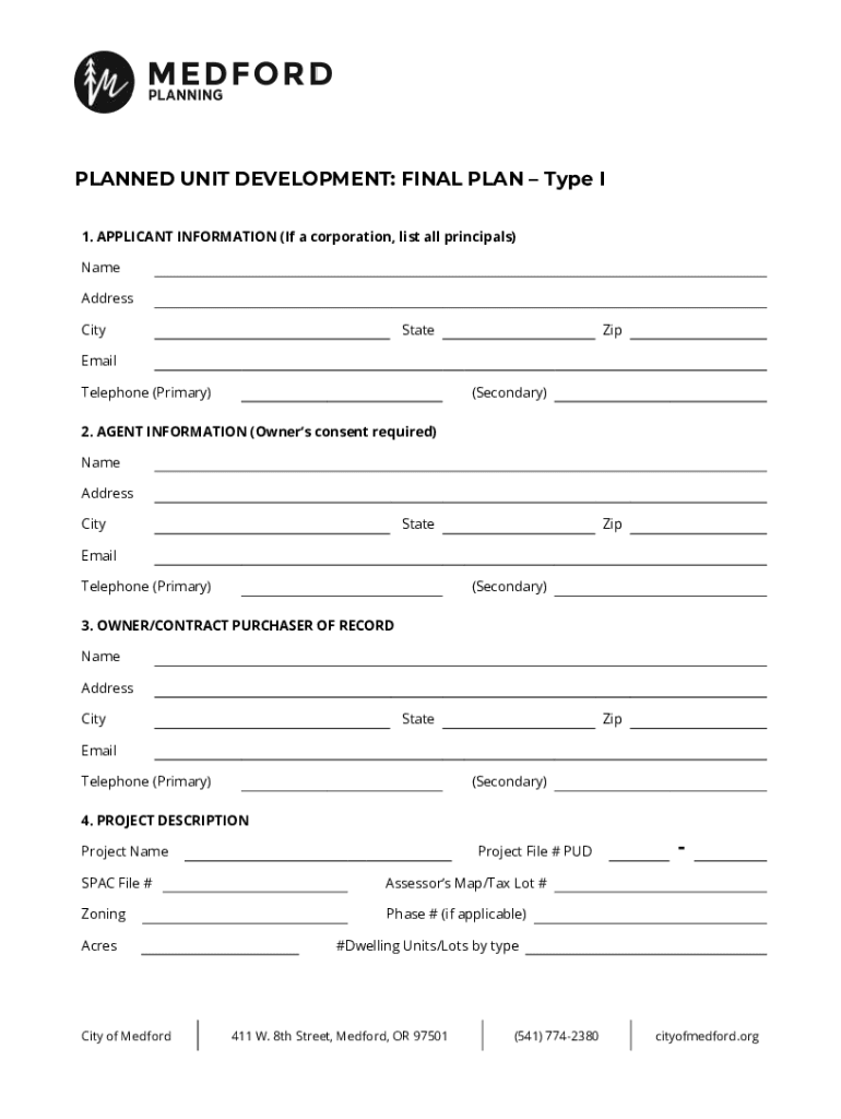 PLANNED UNIT DEVELOPMENT: FINAL PLAN Type I 1. APPLICANT INFORMATION (If a corporation, list all principals) Name Address CityStateZipEmail Telephone (Primary)(Secondary)2. AGENT INFORMATION (Owners