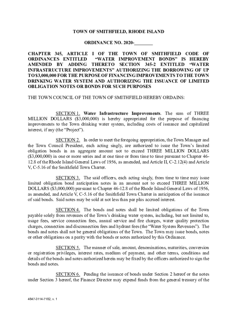 TOWN OF SMITHFIELD, RHODE ISLAND ORDINANCE NO. 2020___ CHAPTER 345, ARTICLE I OF THE TOWN OF SMITHFIELD CODE OF ORDINANCES ENTITLED WATER IMPROVEMENT BONDS IS HEREBY AMENDED BY ADDING THERETO SECTION