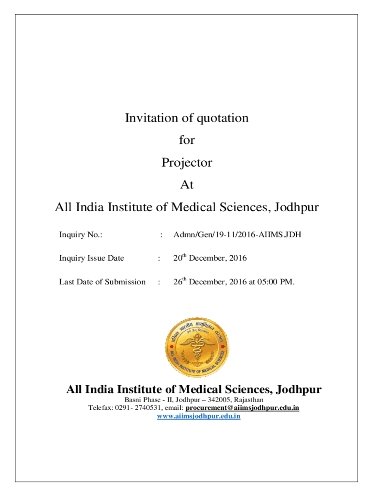 Invitation of quotation for Projector At All India Institute of Medical Sciences, Jodhpur Inquiry No.::Aden/Gen/1911/2016AIIMS. Inquiry Issue Date:20th December, 2016Last Date of Submission:26th December