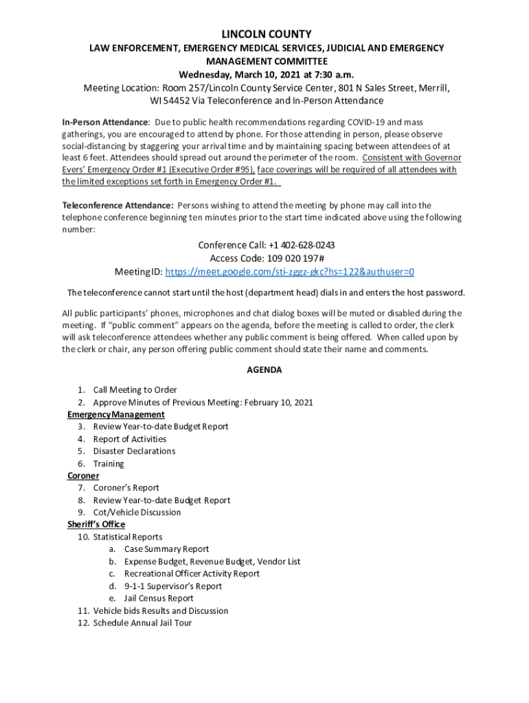 LINCOLN COUNTY LAW ENFORCEMENT, EMERGENCY MEDICAL SERVICES, JUDICIAL AND EMERGENCY MANAGEMENT COMMITTEE Wednesday, March 10, 2021, at 7:30 a.m. Meeting Location: Room 257/Lincoln County Service Center,