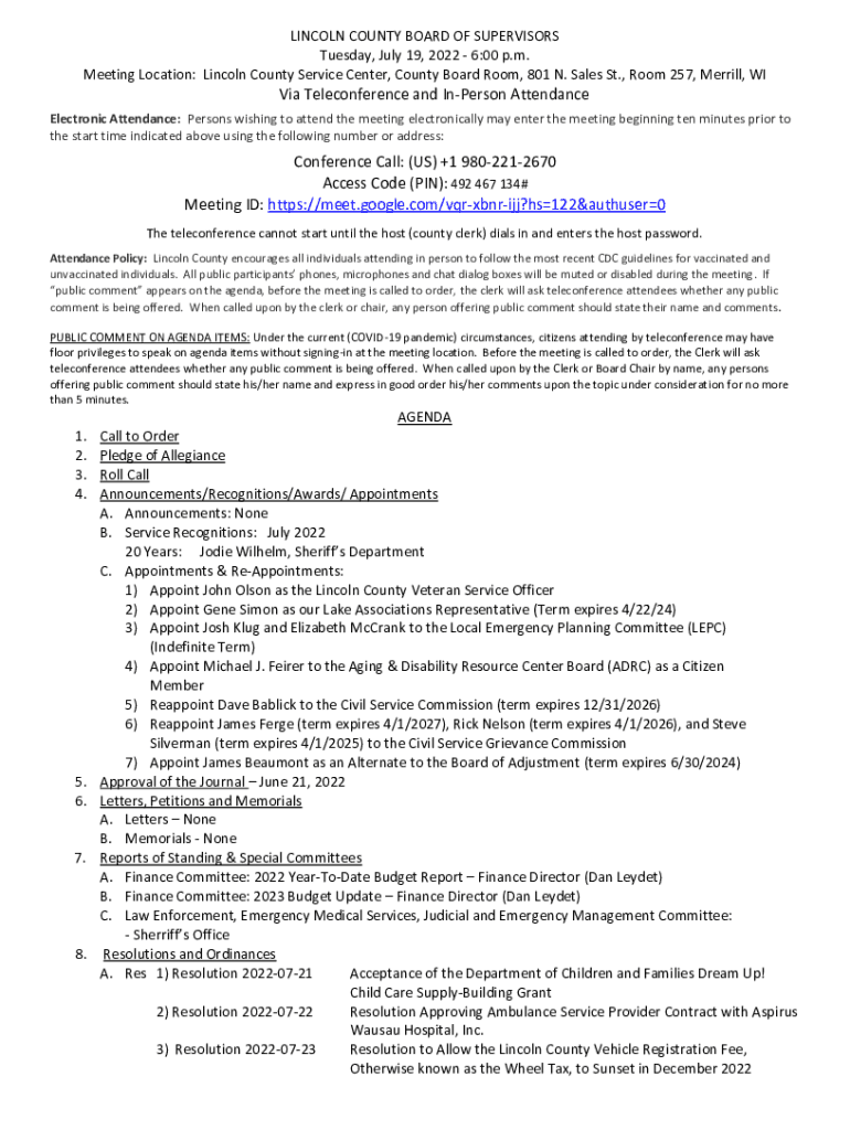 LINCOLN COUNTY BOARD OF SUPERVISORS Tuesday, July 19, 2022 6:00 p.m. Meeting Location: Lincoln County Service Center, County Board Room, 801 N. Sales St., Room 257, Merrill, Livia Teleconference and