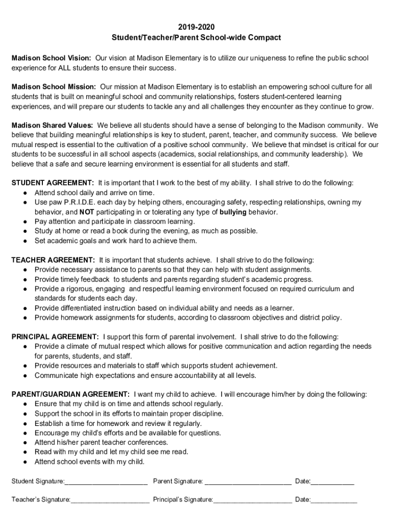 20192020 Student/Teacher/Parent School wide Compact Madison School Vision: Our vision at Madison Elementary is to utilize our uniqueness to refine the public school experience for ALL students to