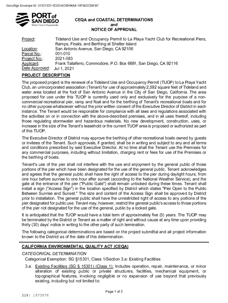 DocuSign Envelope ID: 013C13370CD04C6884A410F5E072AFB7CEQA and COASTAL DETERMINATIONS and NOTICE OF APPROVAL Project: Location: Parcel No.: Project No.: Applicant: Date Approved:Tideland Use and Occupancy
