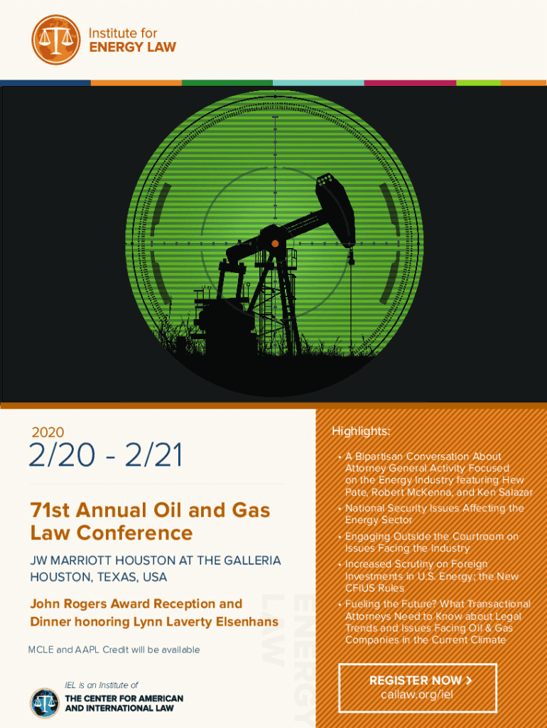 Highlights:20202/20 2/21 71st Annual Oil and Gas Law Conference JR MARRIOTT HOUSTON AT THE GALLERIA HOUSTON, TEXAS, ENERGY LAW John Rogers Award Reception and Dinner honoring Lynn Poverty Elephant