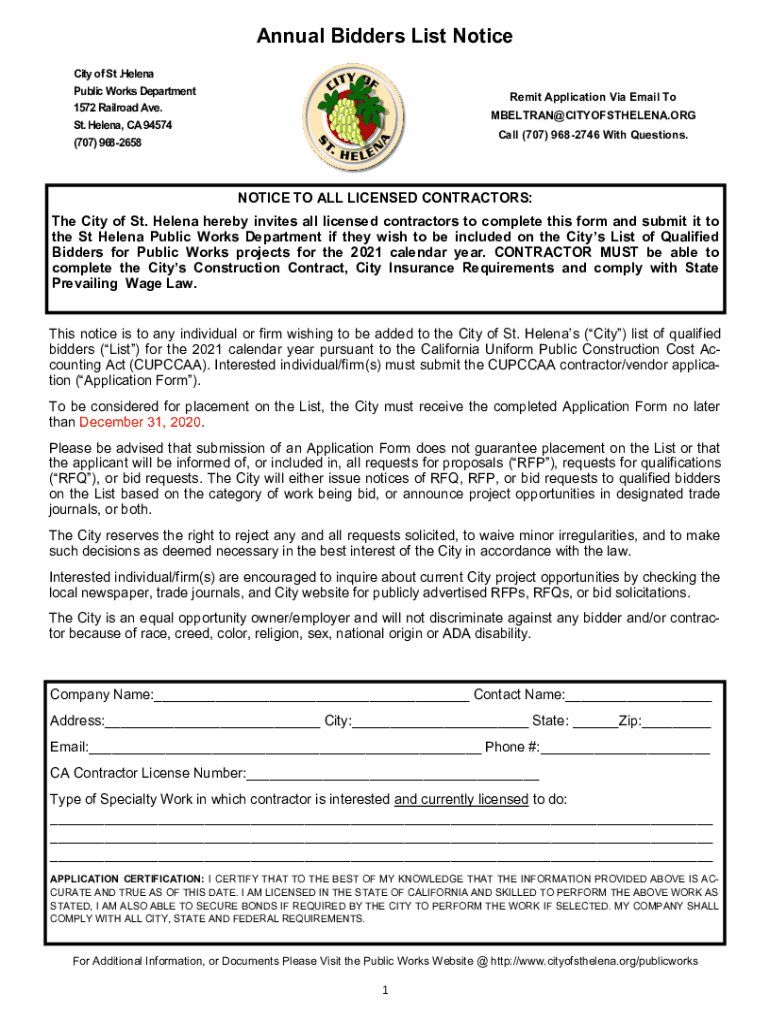 Annual Bidders List Notice City of St. Helena Public Works Department 1572 Railroad Ave. St. Helena, CA 94574 (707) 9682658Remit Application Via Email To MBELTRAN@CITYOFSTHELENA.ORG Call (707) 9682746