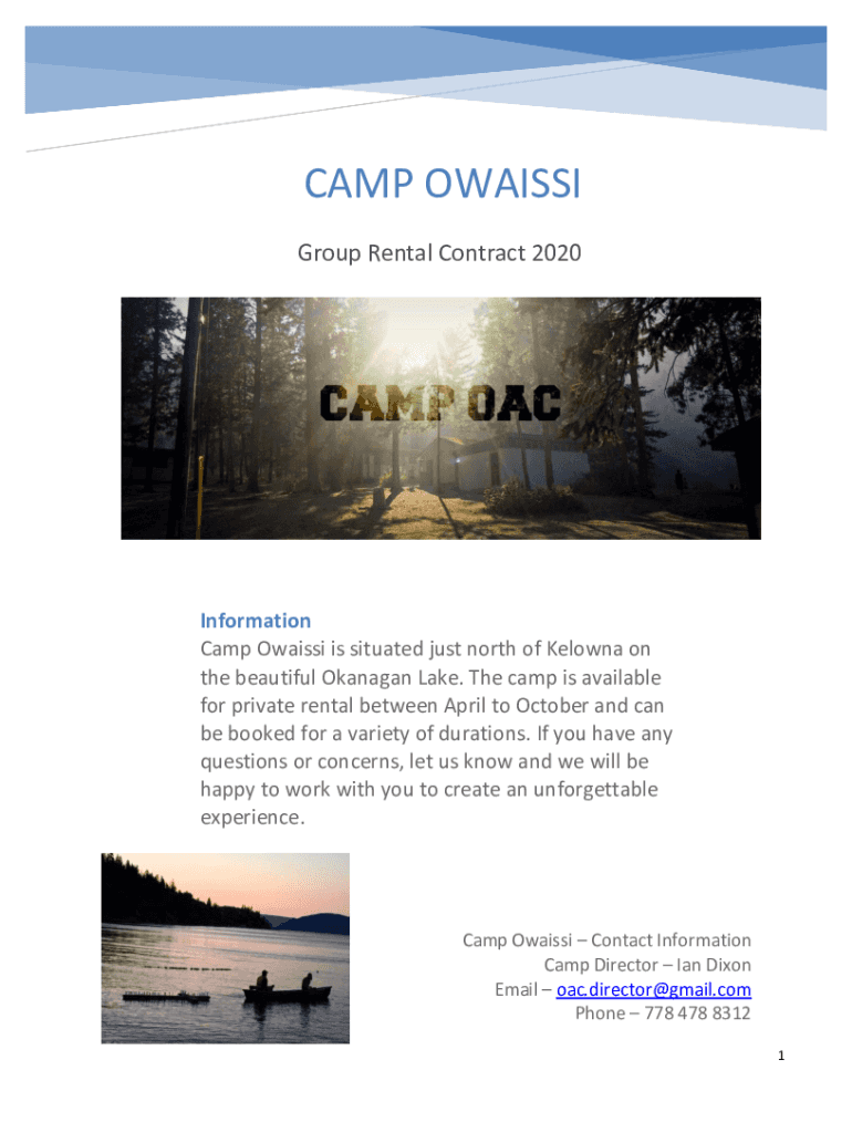 CAMP OWASSO Group Rental Contract 2020Information Camp Owasso is situated just north of Kelowna on the beautiful Flanagan Lake. The camp is available for private rental between April to October and