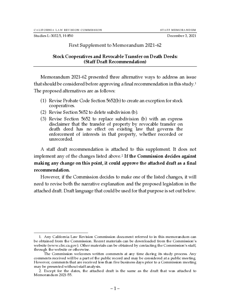 CALIFORNIA LAW REVISION COMMISSIONSTAFF MEMORANDUMStudies L3032.5, H850December 3, 2021First Supplement to Memorandum 202162 Stock Cooperatives and Revocable Transfer on Death Deeds: (Staff Draft