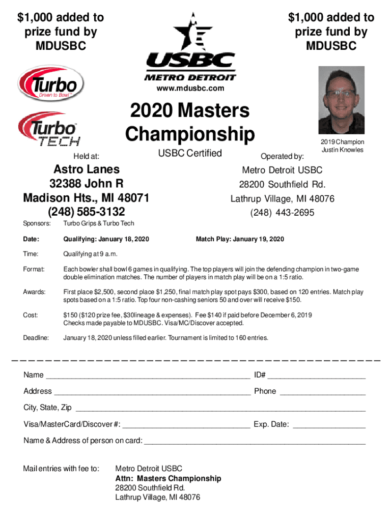 $1,000 added to prize fund by MDUSBC$1,000 added to prize fund by MDUSBCwww.music.com2020 Masters Championship USB CertifiedHeld at:Castro Lanes 32388 John R Madison Hts., MI 48071 (248) 5853132Operated