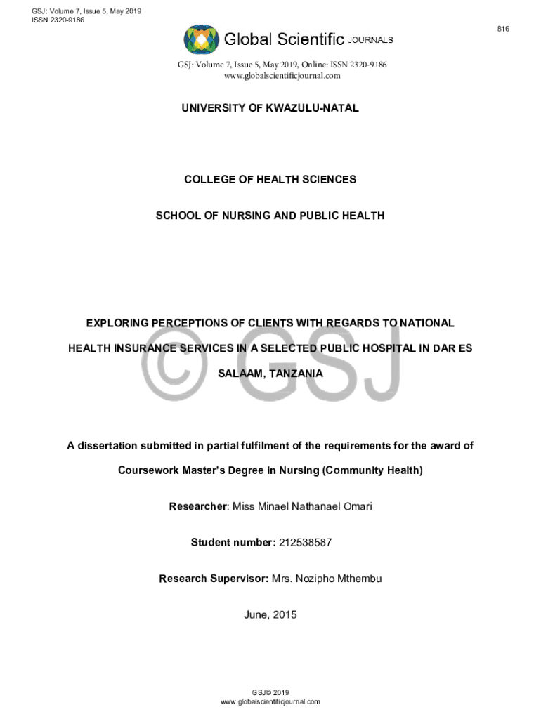WSJ: Volume 7, Issue 5, May 2019 ISSN 23209186816GSJ: Volume 7, Issue 5, May 2019, Online: ISSN 23209186 www.globalscientificjournal.comUNIVERSITY OF KWAZULUNATALCOLLEGE OF HEALTH SCIENCES SCHOOL