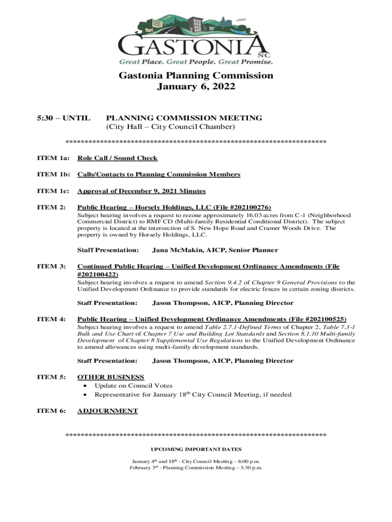 Gastonia Planning Commission January 6, 2022 5:30 UNTILPLANNING COMMISSION MEETING (City Hall City Council Chamber)******************************************************************** ITEM 1a:Roll